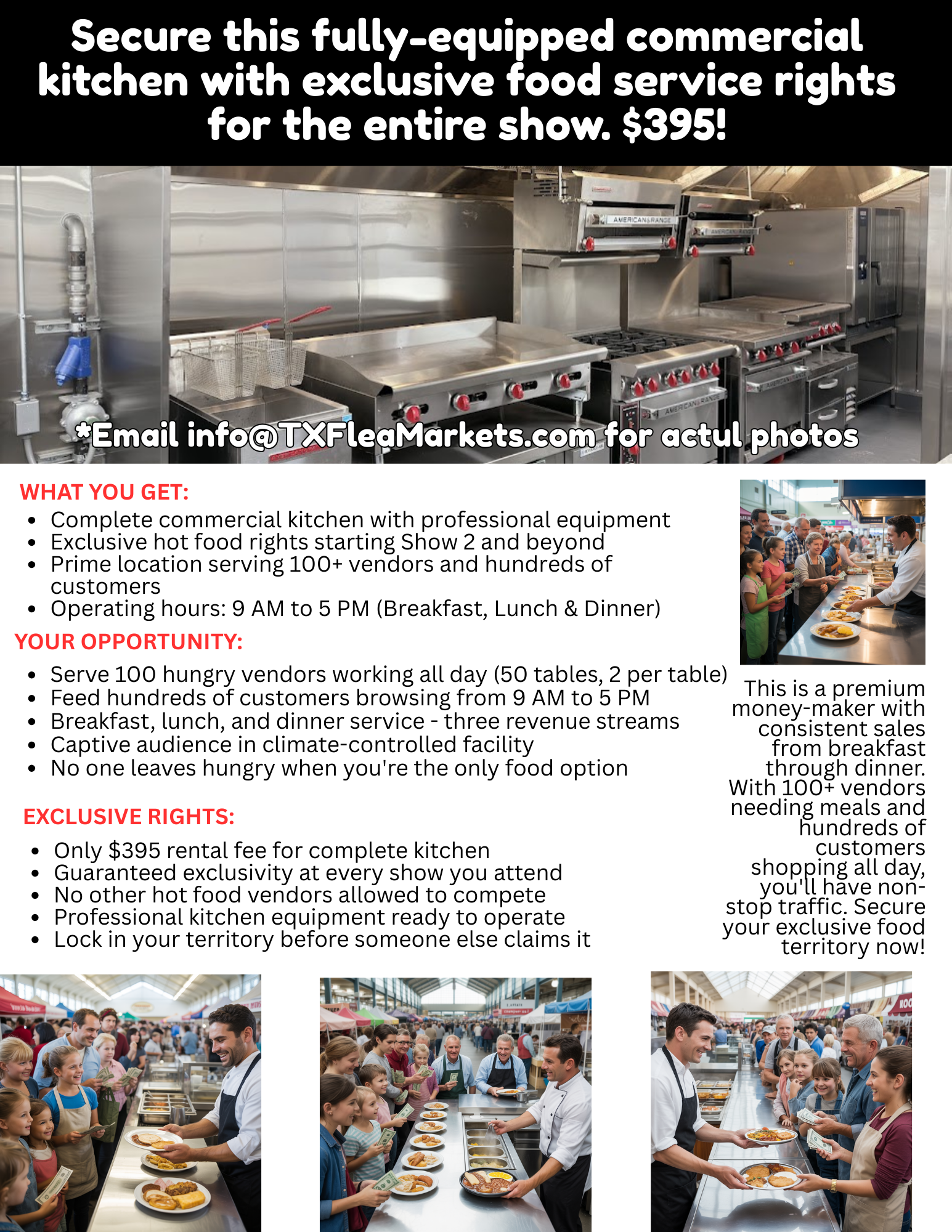 Unlock unparalleled business potential with a fully equipped commercial kitchen designed to meet your culinary needs. This exclusive kitchen space is your golden opportunity to provide mouthwatering breakfasts, satisfying lunches, delectable dinners, and refreshing beverages to over 100 vendors and hundreds of shoppers daily. Whether you’re an established food service entrepreneur or a budding brand, this facility ensures you excel at fulfilling the demands of a bustling marketplace.