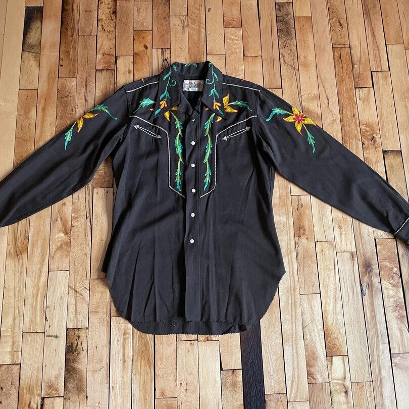 Vintage western brands, Wrangler, Rockies, and Roughrider. Many sizes available with items ranging from button ups, to boots, and even chaps!